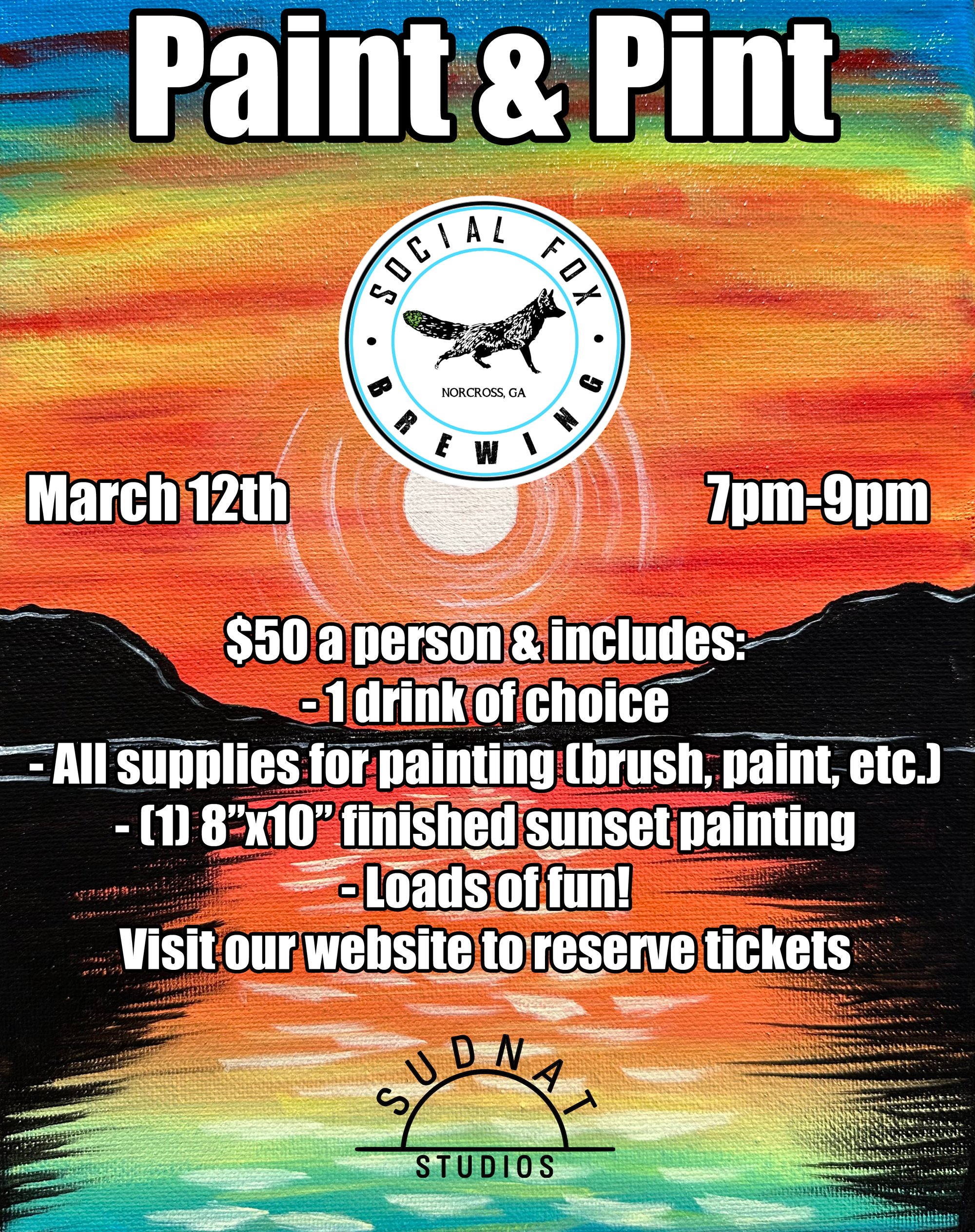 Join us in painting your own colorful sunset painting!! All supplies will be provided at start of event. Ticket includes 1 drink of choice, supplies to complete the painting, (1) 8"x10" canvas, instructions to complete the image & loads of fun!