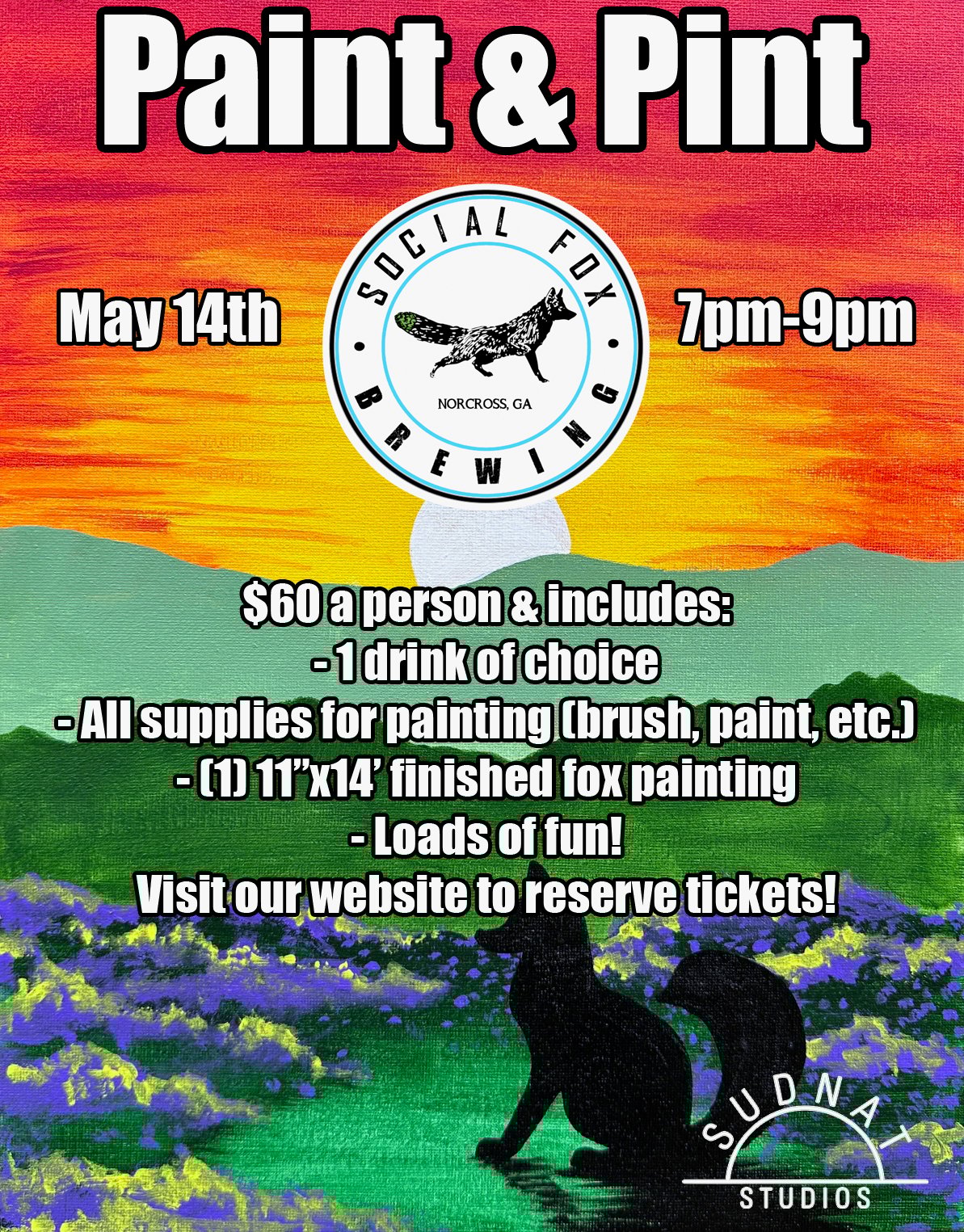 Join us in painting your very own fox sunset painting!! All supplies will be provided at the start of the event. Ticket includes 1 drink of choice, supplies to complete the painting, (1) 11"x14" canvas, instructions to complete the image & loads of fun!